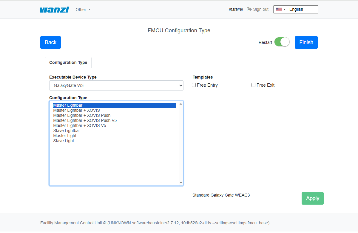 Next, you can select the Configuration Type and click Apply, then confirm the configuration reload. You can change your Configuration Type selection later. If the default Configuration Type is selected, enable the Restart option, then click Finish.